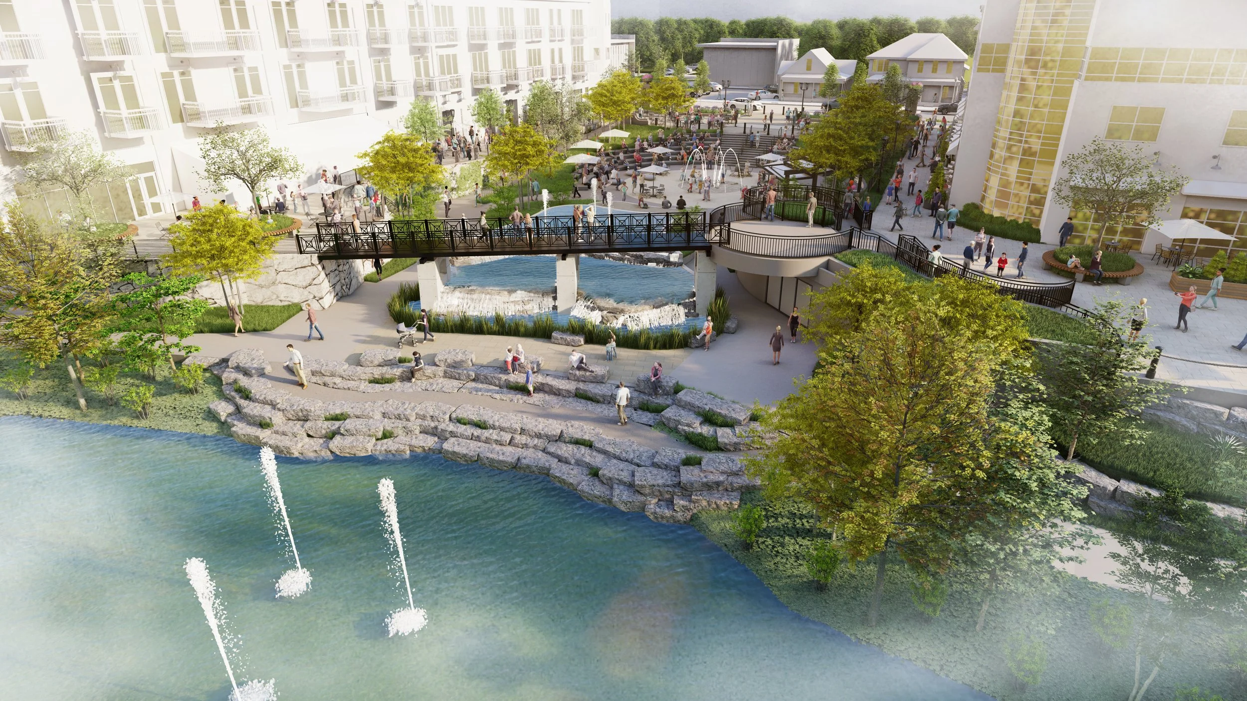 At build-out, the 240,000-square-foot mixed-use development features a curated blend of amenities, including ground-level retail, flexible office space, and residential lofts, complemented by a network of thoughtfully designed public spaces. These include activated plazas, a signature sunken park, a lagoon with a water wall, interactive water features, and integrated public art. The district is further anchored by the Creekside Event Center, reinforcing its role as a year-round destination for community gathering and cultural activity.